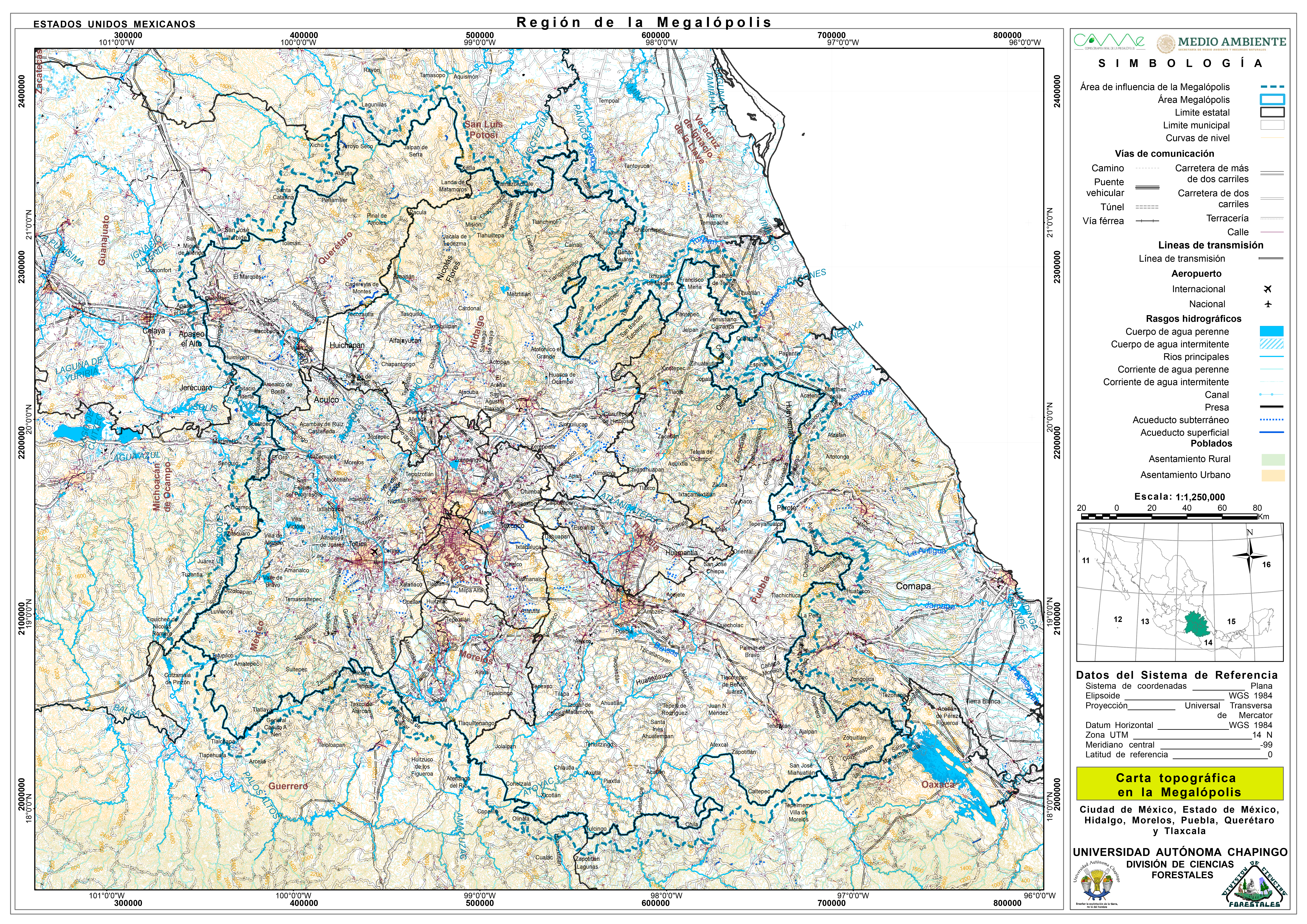 Carta topográfica que corresponde al área de la Megalópolis, se representan los elementos topográficos que conforman toda el aérea.