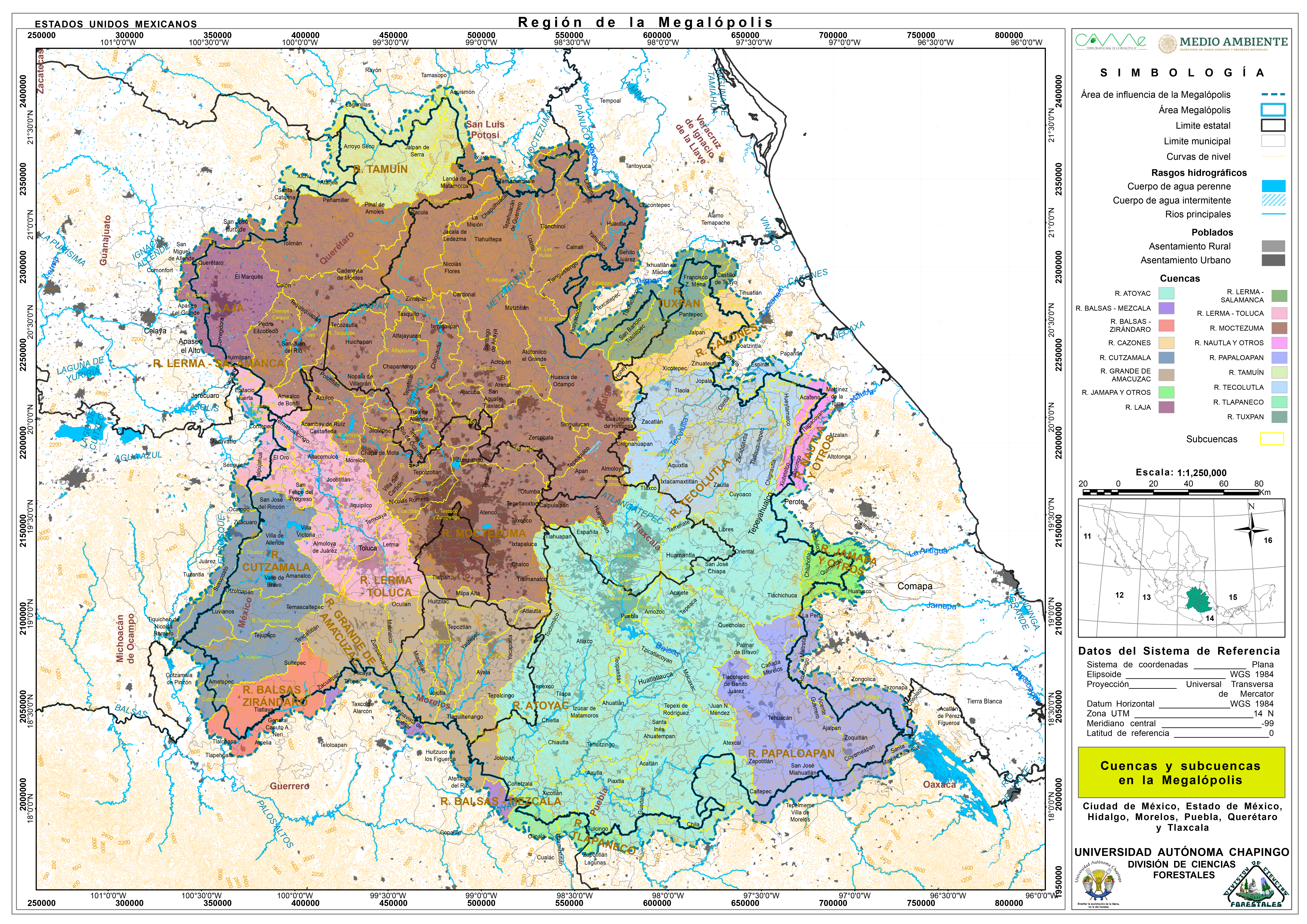 Carta geográfica donde se representan elementos hidrológicos como flujos y cuerpos de agua, además se representan las cuencas hidrográficas dentro de la Megalópolis.